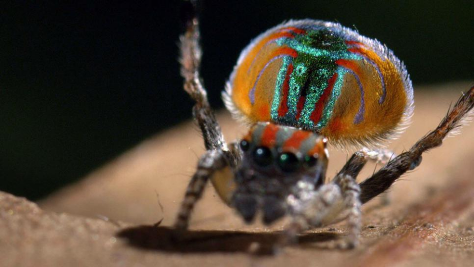 图 | 澳大利亚孔雀蜘蛛求偶时发光的腹部。(图片来源于展览图册)