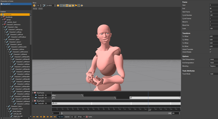 全新的非线性编辑器支持不同种类轨道拼接动画,用户可以从肢体和面部动画库中,将身体和表情的动画片段同时导入到不同的轨道中进行创作:拼接,叠加或混合操作,完成快速动画的制作。
