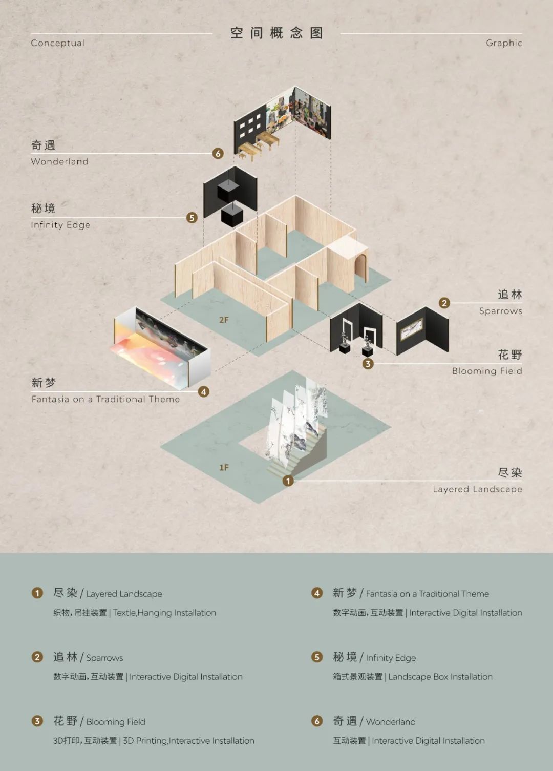 「结合传统元素创造现代奇迹,让大家在奇迹中遇见传统新生」是展览团队为「奇遇」赋予的空间概念。该空间邀请大众与岭南国画来一场亲密体验,激发他们自主探索的兴趣。