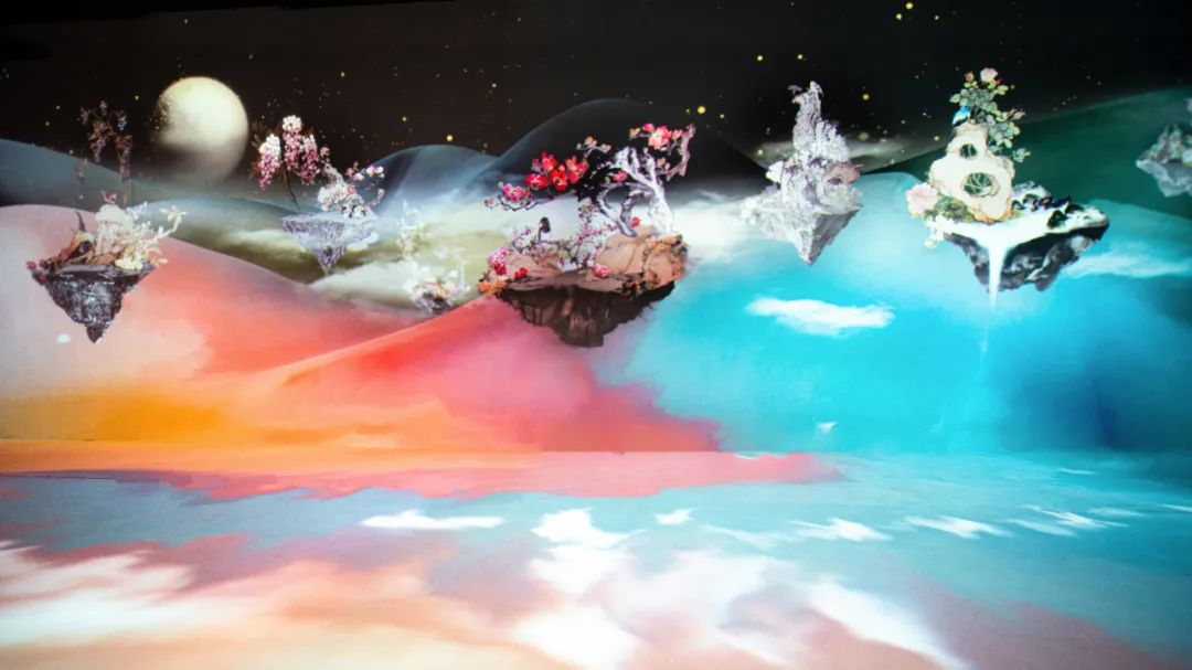 重重叠叠的山峦刻画着星球表面凹凸不平的纹理,长有岭南花鸟绿植的小岛在星空中漂浮。实时渲染让色彩从远到近,缓缓流淌,贯穿着整个空间。