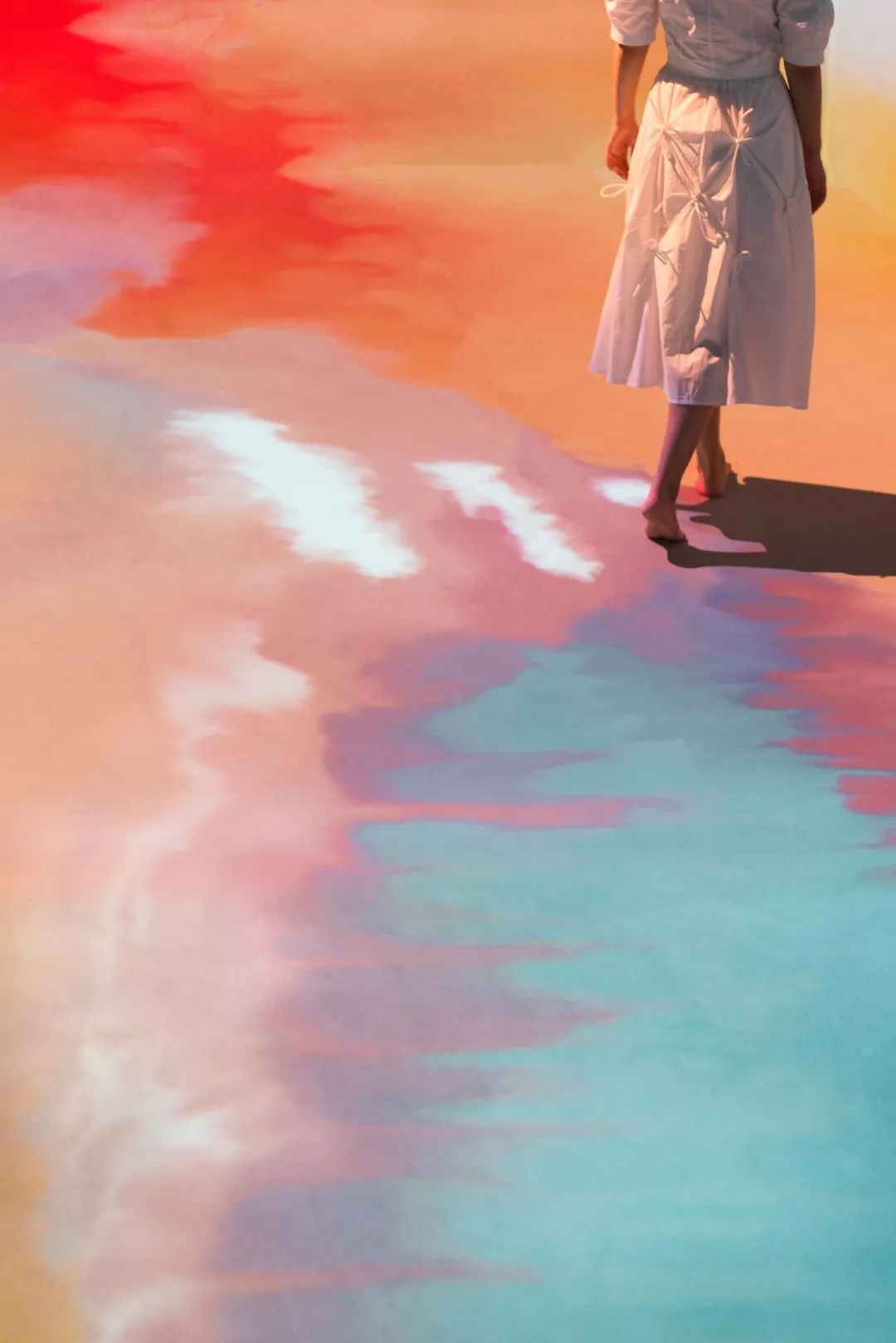 团队在互动体验上的用心创作不仅局限于立面空间。空间中流动的色彩同时贯穿立面与地面空间,渲染浪漫氛围的视觉元素。此外,它还是表达岭南画派「撞水撞粉」的媒介。当传统国画技法被转化为互动体验,岭南国画的精髓不只局限于纸墨画笔上。