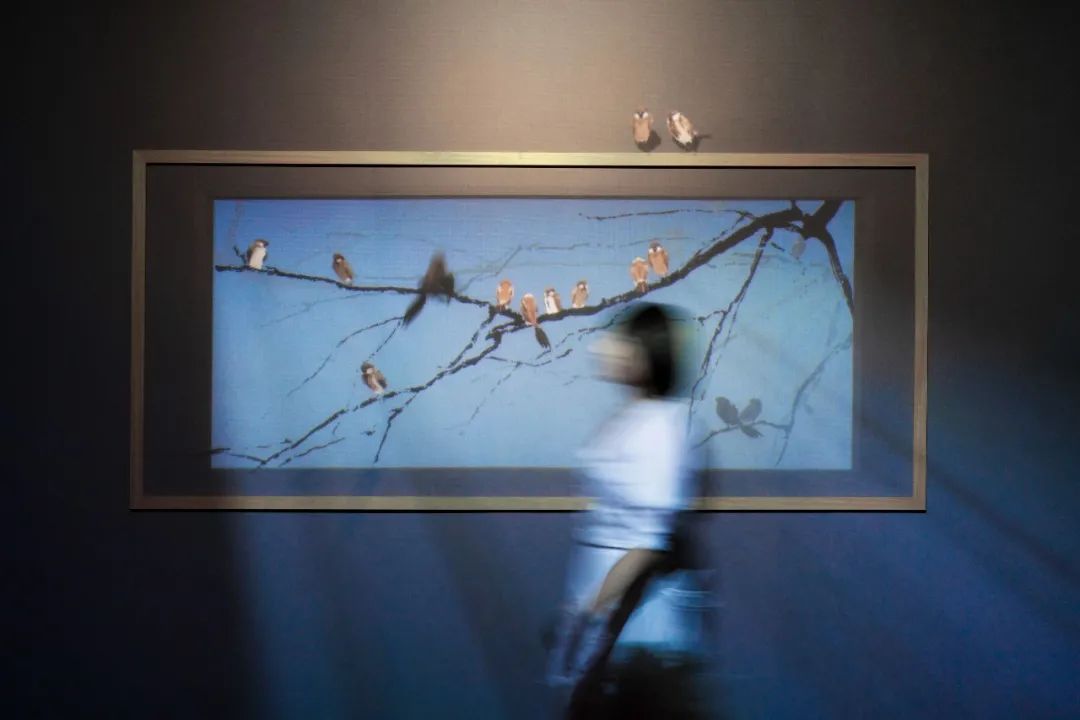 岭南国画的精妙之一在于其灵活的绘画技法让花鸟生灵在平面的画纸上也能传递出自然灵动的特点。互动影像装置化静为动,让国画麻雀「飞」出画纸,与人呼应,传递生命力。