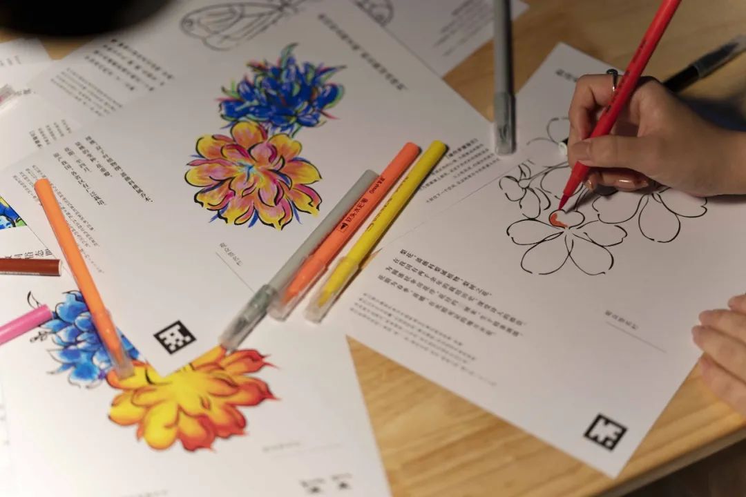 值得一提的是,供人们填色所用的白描线稿为岭南画派先师居廉与居巢在十香园授课时所作。团队为这些珍贵的线稿设计了与国画相仿的布局,鼓励观众自主填色,使每一位观众都能亲身感受白描线稿的气韵和撞水撞粉的兴味。