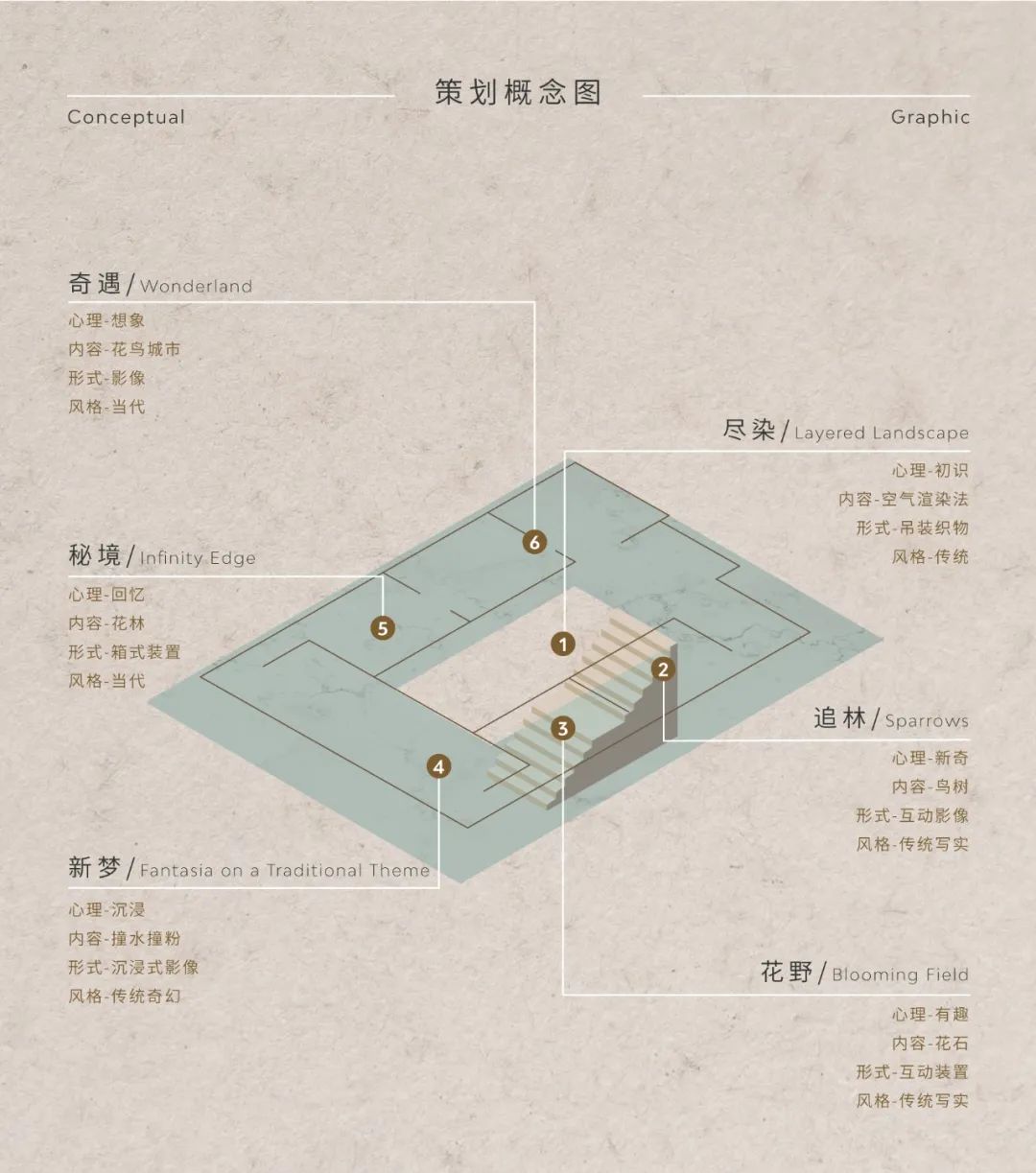 无论是画面内容还是呈现形式,「奇遇」空间的设计构思都包含着岭南画派「折衷中西,融汇古今」的基本理念。而内容上,团队希望把岭南国画中的花鸟元素与当代广州城景融合, 传递「传统文化在现代岭南新生」的概念。
