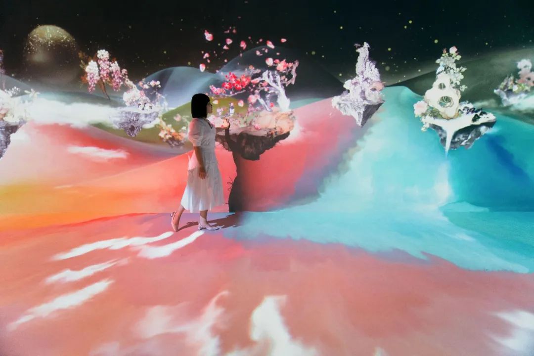 当人们靠近星球上的漂浮岛,漂浮岛上迸发出花瓣,增添游人在互动中的惊喜感,感受岭南画派源源不断的生命力。
