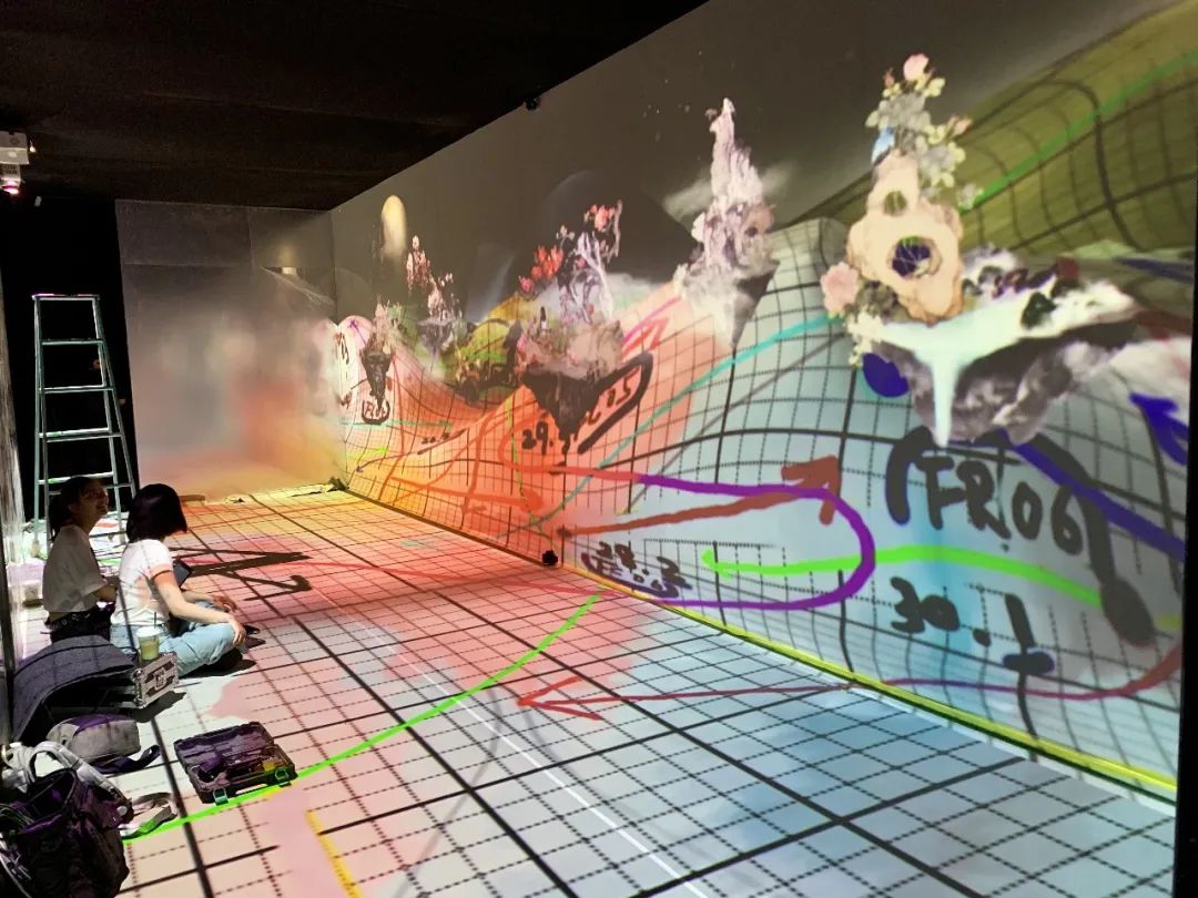 人们化身为沾有钛白水墨的毛笔在空间穿梭,步履之间,与地面上的色块发生碰撞,形成独特的色彩纹理。科技把传统绘画技法演绎得淋漓尽致,「撞水撞粉」的绘画技法丰富了空间,为现代的创新体验赋予深厚的文化概念。