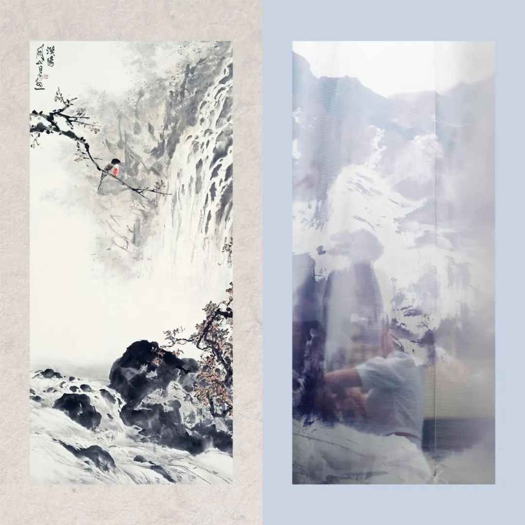 采自岭南国画大师关山月的《鼎湖飞瀑组画之三:鸣禽飞瀑》。融合岭南画派独特的绘画技法,作品在十香园天井光线的衬托下,传递岭南书画中特有的空间感与光影感。