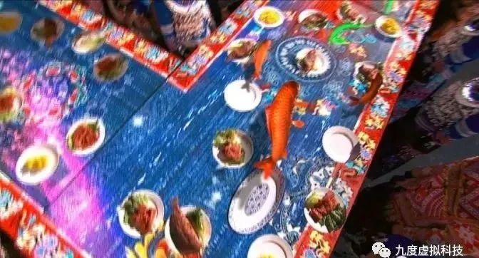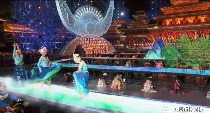 AR虚拟场景在开场段落中首先呈现出“铁路开到苗家寨”的高铁动态,紧接“侗族长桌宴”的鱼跃动态,转至“长桌画卷”的自然场景后,最后迎来“大数据包裹”侗寨建筑的气氛场景,令人叹为观止。