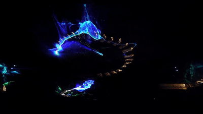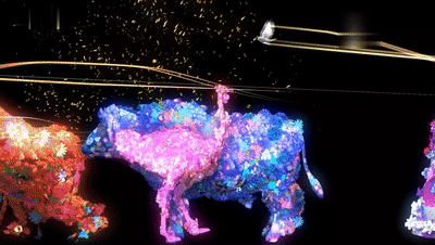 每个生命赋予不同的颜色、纹理、变化、生命周期、声音甚至味道。有的精灵扑腾出浓郁的粒子香氛,有的精灵发出脉冲信号般的光波。森林里不断涌出很多活物,蜥蜴、瓢虫、蝴蝶,还有飞翔的鲸鱼。