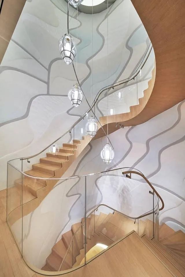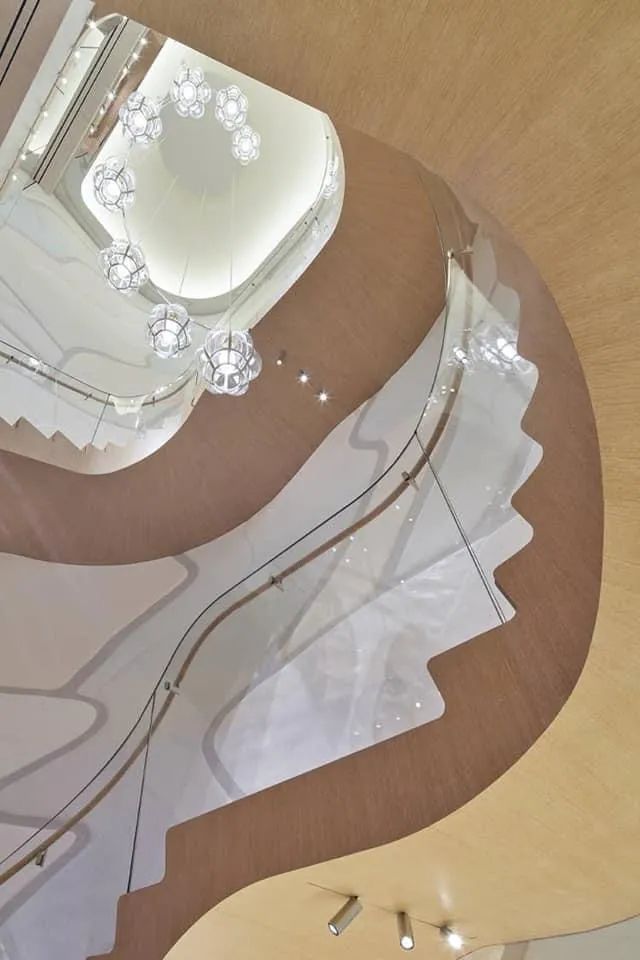 举例来说,消费者一走进店内,目光将不由自主被一只巨型的荧光水母装置艺术所吸引,在摆上精致包款的陈列台中穿梭,走道底处如深海蓝洞的神秘空间,勾起好奇心,让人想一亲芳泽。在一二楼的皮革、香水展厅,与三四楼的服饰、皮革展厅返往,连楼梯的空间都延续了水波的流动感,通过玻璃材质,展现缎带般的柔顺曲线与海底泡泡的晶莹透亮。