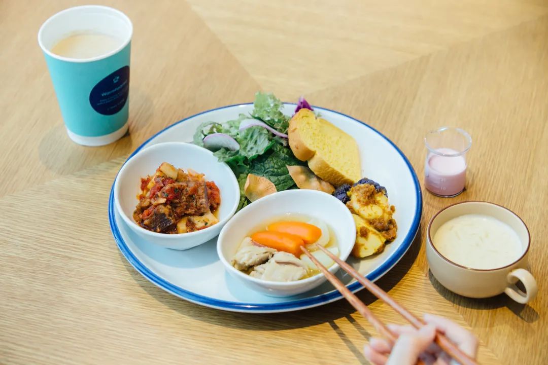刚刚提到的S/PARK Café,就位在S/PARK的一楼,标榜以蔬菜(素食)为主,提供自选色拉、配菜的午餐服务,价格亲民(900~1,500日圆,约合人民币53~90元),又有季节性的食材供应,深受附近上班族的喜爱。
