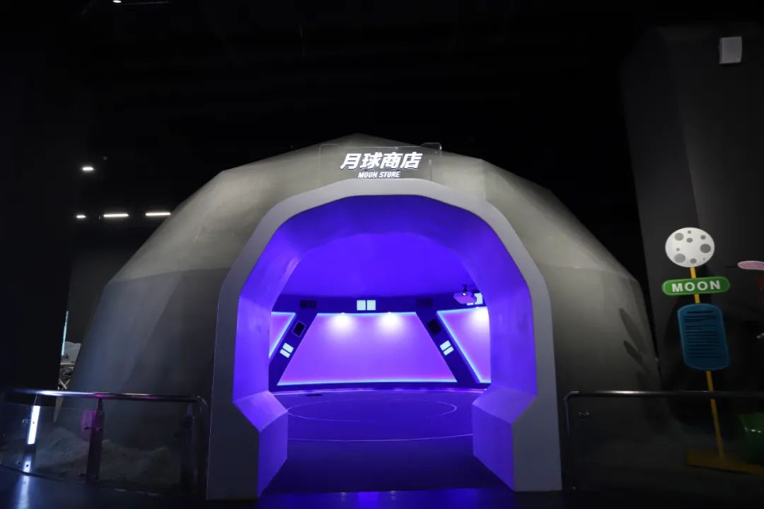 与场馆其他区域相比,月球蹦床面对了较低年龄段的体验者,通过体感互动投影与室内组合式蹦床乐园相结合,营造月球基地氛围,使体验者游乐的同时感受来自月球的神秘力量。