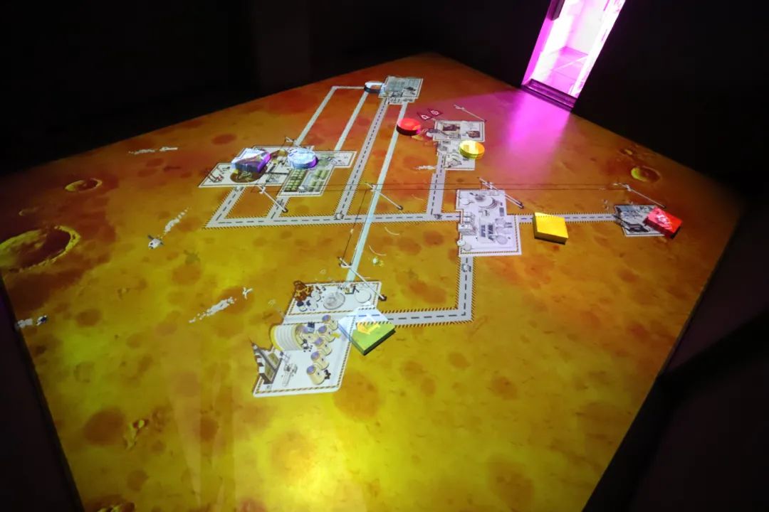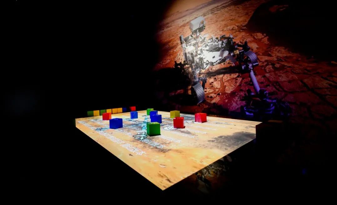 以火星基地为主题背景,通过互动投影的方式,让体验者对火星基地建设相关内容有一定的认知。在这里,你可以用自己的意愿建造一个火星基地,所有的建筑、轨道以及交通工具都是由实体积木投影感应所生成。