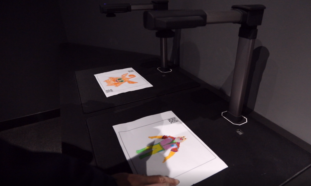 通过多媒体互动形式,体验者可以将自己亲手涂的角色扫描入墙体以此达到互动效果,主要目的是训练参与者的创新能力、动手能力以及开拓想象力。