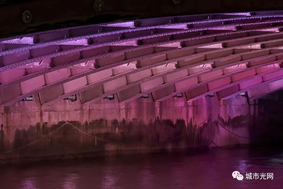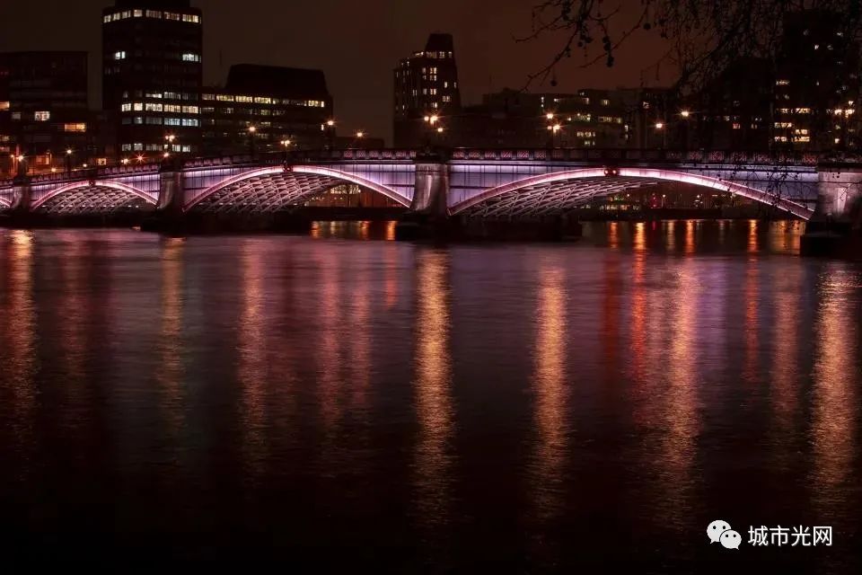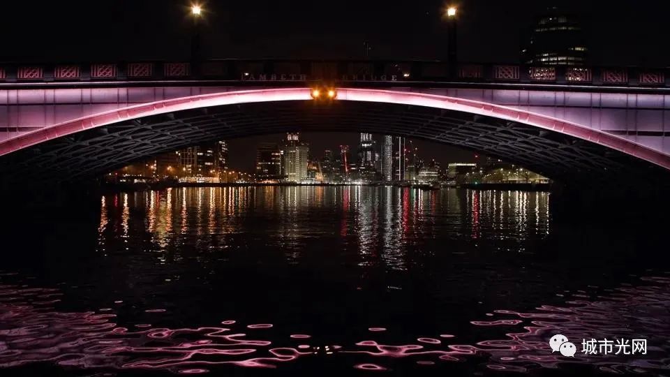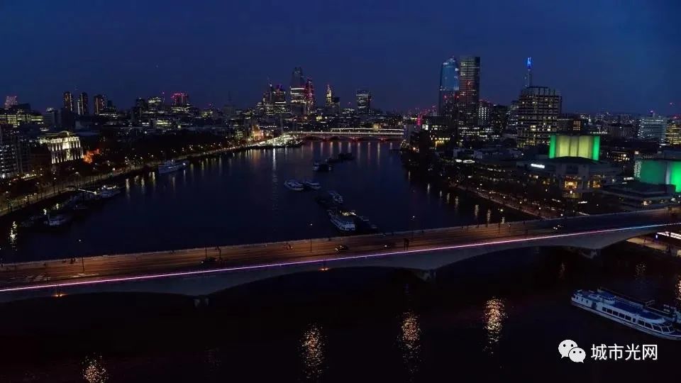 Waterloo大桥作为伦敦最长的桥梁,艺术家仅仅通过一条简单的光带对桥梁的线条进行了增强,并引入了柔和的色彩来照亮两侧桥墩的中央。