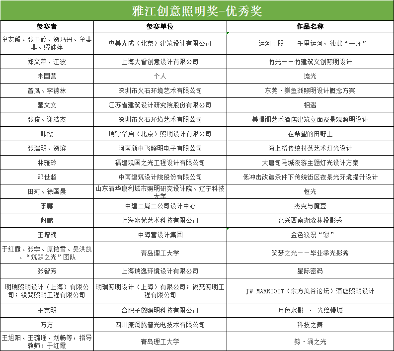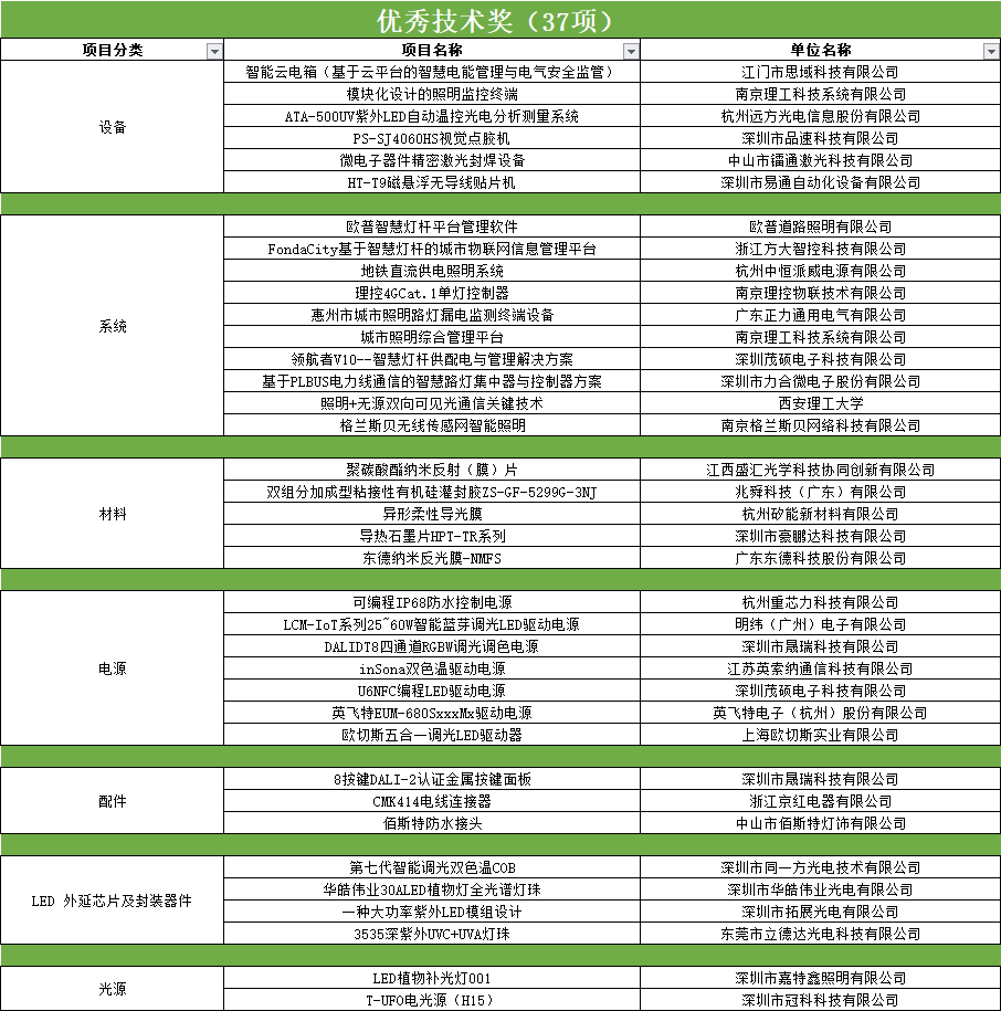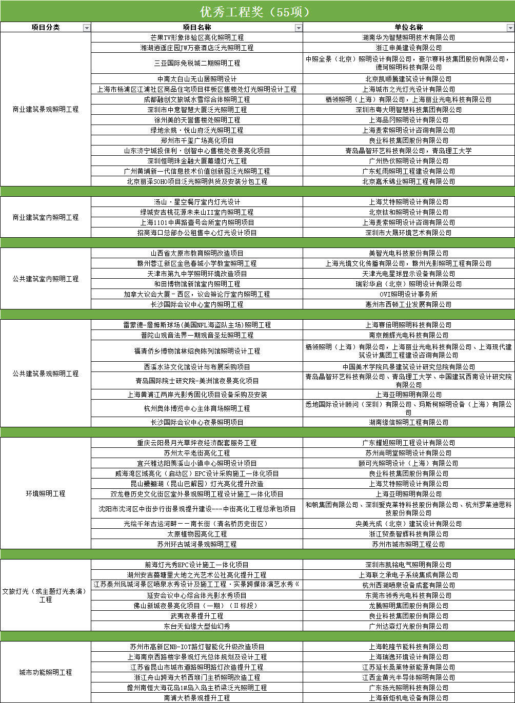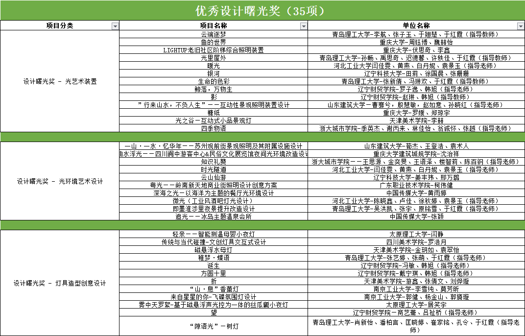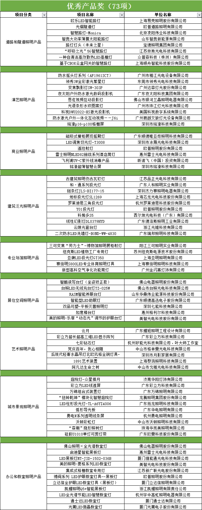 根据优秀奖评审结果显示,产品类有73个项目入围,技术类有37个项目入围,工程类有 55个项目入围,创新融合奖-设计曙光奖有 35个项目入围,创新融合奖-雅江创意照明奖有20个项目入围。入围优秀奖的项目在外观设计、技术及工艺、经济性分析及实际运用等评价维度均具有一定创新性,是同类项目中的翘楚,获奖实至名归,值得祝贺。