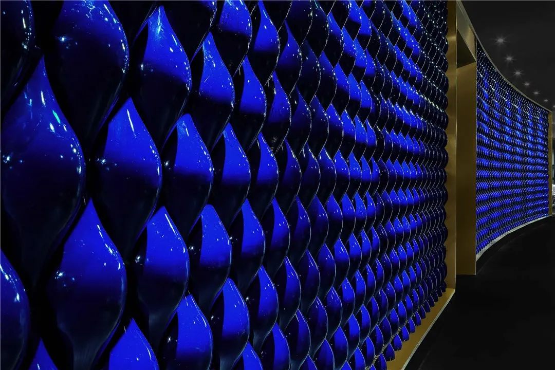 餐厅大厅的顶部,运用霁蓝釉作为装饰重点,大厅顶部装有上千个霁蓝釉制成的陶瓷杯,使用RGB光源会有意想不到的效果,通过灯光颜色的变换衬托出瓷杯的美丽,营造不同的用餐氛围。
