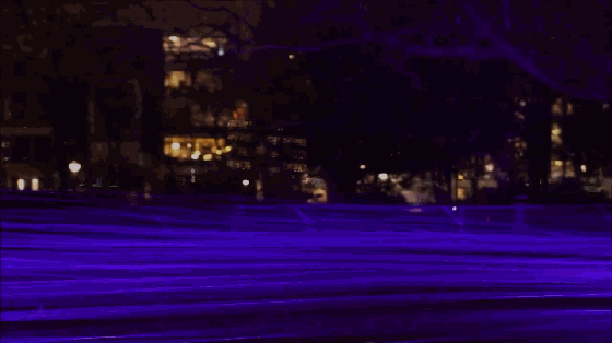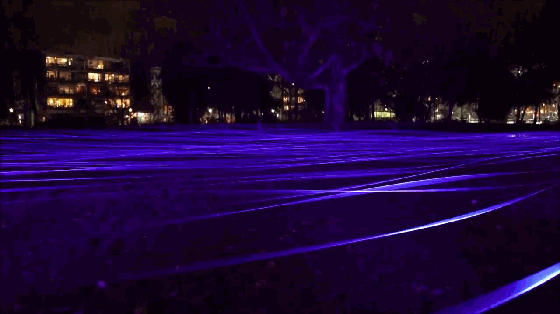 「AFTEREAL」就是由数百根富有弹性的荧光线条组成,在小型马达的帮助下上下移动,黑暗中,紫色光线将它们照亮。