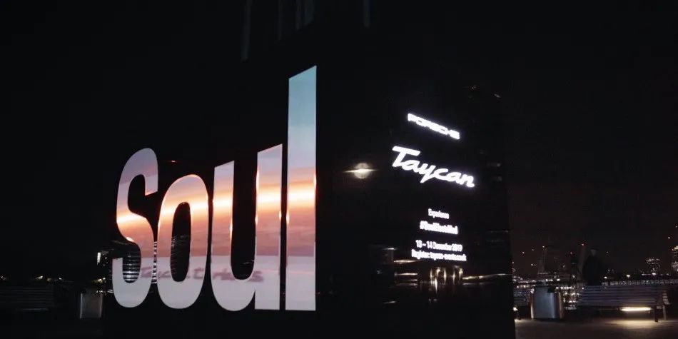 “ Soul”一词的正面是镜面镂空结构配合播放动态视频的LED屏幕