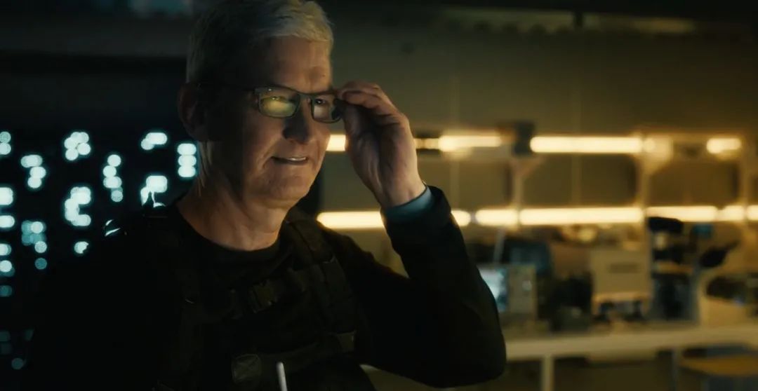 在转场影片中,苹果使用了特工闯入苹果大楼“盗取“M1芯片创意,在影片结束时特工把盗取的芯片装入iPad Pro,同时取下面具——原来是库克。