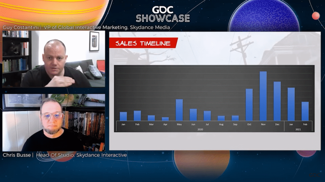 这个数据是上周开发商Skydance Interactive在数字GDC演讲中透露的。当时透露的一张图表虽然没有任何具体的数字,但确实给出了游戏在过去一年的总体销量表现。《行尸走肉:圣徒与罪人》于2020年1月首次在PC上推出。但在10月份,当游戏登陆Facebook的独立头显时,该月的销量增加了三倍多。