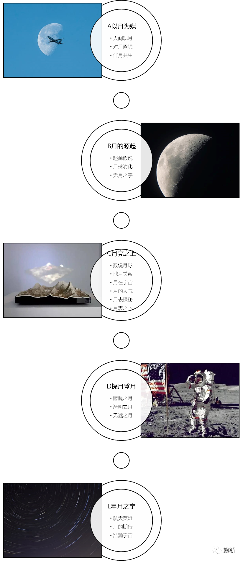 从我们人类对月亮的疑惑开始讲起,“小时不识月,呼作白玉盘”,如果没有人告诉我那是月亮,那它会是什么?因为对它的猜想和疑问,就会产生探索的欲望,而探索的欲望,是通过距离的不断缩近来呈现的,采用容易理解的由大到小,由宏观到微观的故事线,所以就有了: