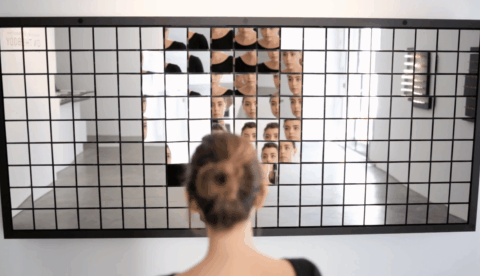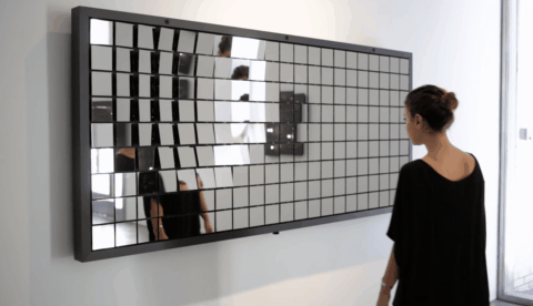 这件作品由将近两百个相同的小镜子排列成一个栅格,以形成一个平坦,均匀的表面。镜子紧紧地挂在墙上,看起来是静止,但它们具有彼此和谐相处的能力。接近艺术品时,各个镜子一起转动,面对旁观者并随其移动。较大的镜子只有一部分会移动,从而产生异常的复眼效果。