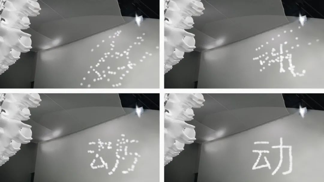 乍一看似乎是一个混沌的运动模式,实际上是经过了复杂的计算编排:百个光点首先绕中心运动——类似于行星的同心运动或昆虫成群飞行,由此创建一个三维的空间。这些光点会时不时地汇聚在一起,形成运动的汉字。一方面给假肢的具体物理性和均匀性带来了反差,另一方面使移动光的非物质性和表现力给人留下了深刻的印象。