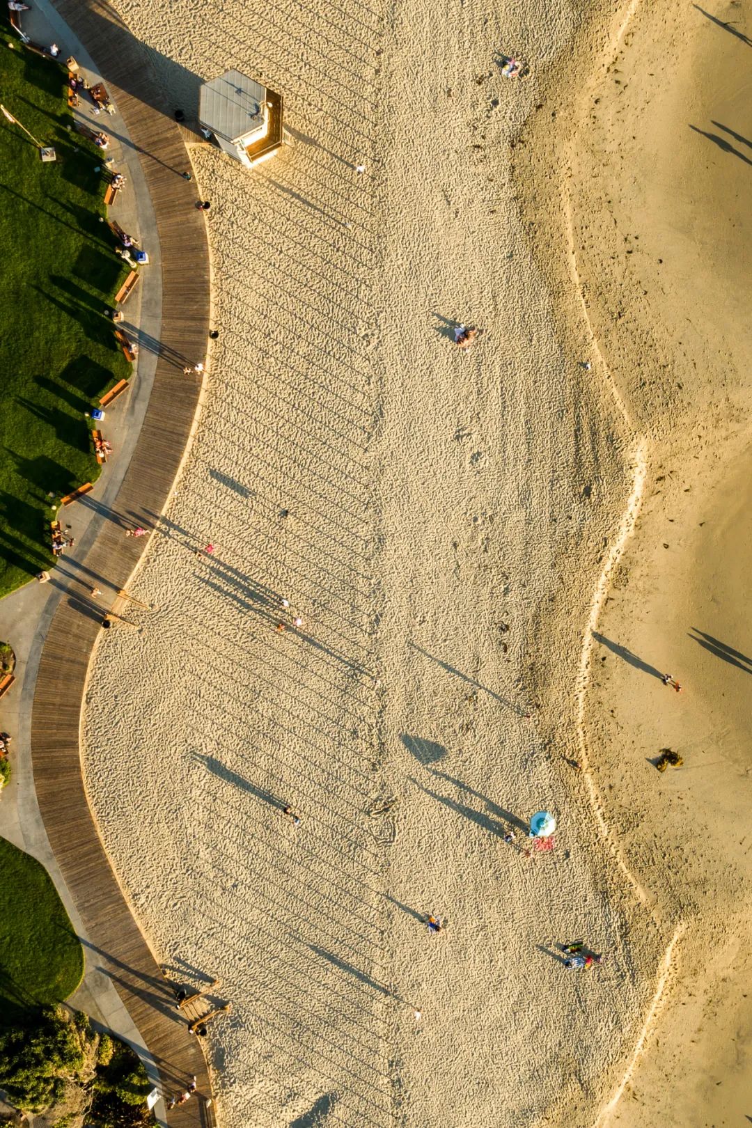 从上方看,阴影投射到沙滩上,产生了日晒等变化的图案。仿佛是天地和自然的分界线,将落日余晖与人群一分为二。从某些角度看,这些柱子排成一排,因此观众可以看到一面完整的倒影墙。日落时分,静谧而美好,镜子仿佛大自然的一部分融入其中。