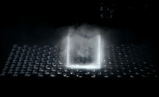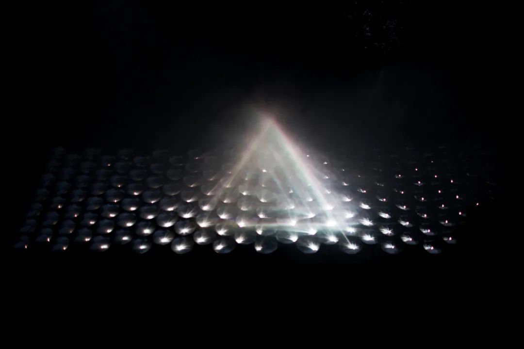Kimchi and Chips采用投影仪和凹形镜面创造出了一种给光赋予实体的观感。Light Barrier装置包含600多个悬挂在半空中的凹形镜面,每一个的曲面和位置都是经过数字模拟而后制造的,它们能够精确地反射空间内8个建筑投影仪所投射的光线,在半空中汇聚出图案,如幽灵一般。与上述镜面本身会产生运动的装置不同,Light Barrier中的镜面是静止的,但来自投影仪的变化光源使得反射光线呈现出动态。