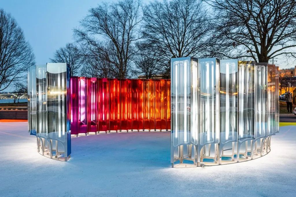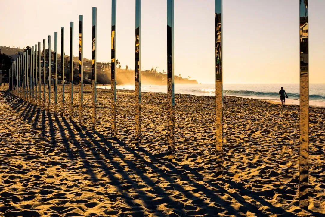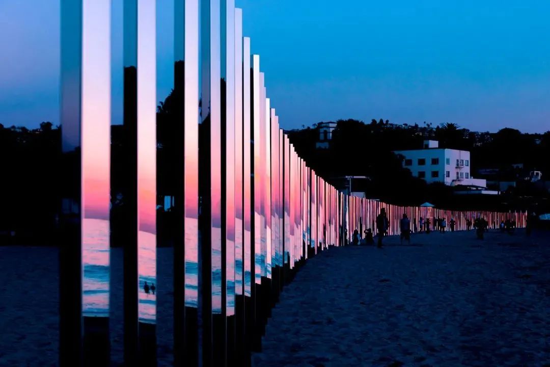美国艺术家Phillip K Smith III安装了一堆镜像柱子反映南加州景观在一天当中的变化。装置沿着海边小镇拉古纳海滩的沙子呈缓和曲线延伸。