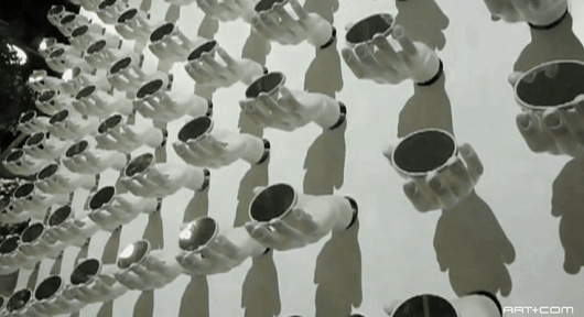 这件作品利用了几乎被人们遗忘的古老技术——用镜子和阳光远距离通信。艺术家在墙壁上安装了一个由100个白色假肢组成的矩阵,这些假肢绕着由电动机控制的自己的轴旋转,每只手都拿着一个精确对准的镜子。强光直接照射到大约4平方米的矩阵上,旋转镜将其作为光的移动点投射到房间并反射到对面的墙上。