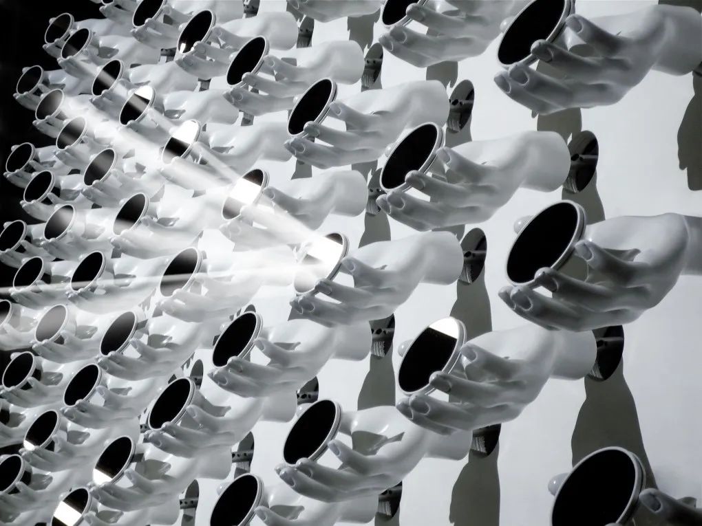 新媒体艺术团队 ART+COM的作品「Mobiloty - reflective Kinematronic II」利用了几乎被人们遗忘的古老技术——镜子和阳光远距离通信。在墙壁上安装了一个由100个白色假肢组成的#矩阵,这些假肢绕着由电动机控制的自己的轴旋转,每只手都拿着一个精确对准的镜子。强光直接照射到大约4平方米的矩阵上,旋转镜将其作为光的移动点投射到房间并反射到对面的墙上形成汉字。