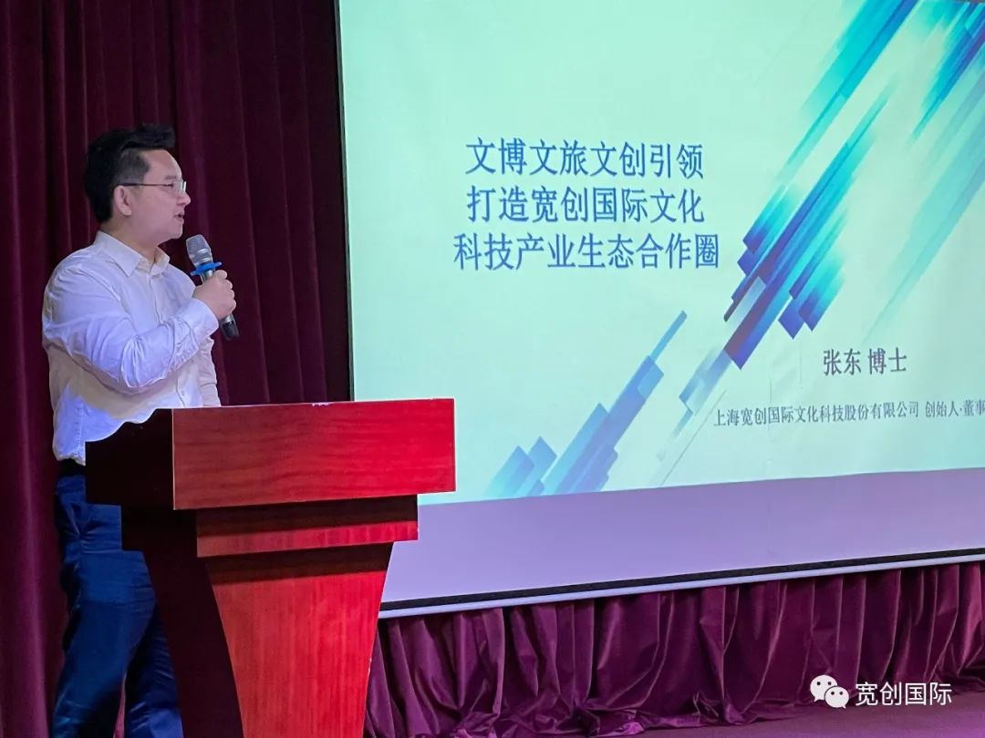 宽创国际创始人董事长张东博士发表《文博文旅文创引领,打造宽创国际文化科技产业生态合作圈》主题演讲,主要就宽创国际的发展历程、经典作品、科技展示、新城开发项目四个内容和大家进行了分享。