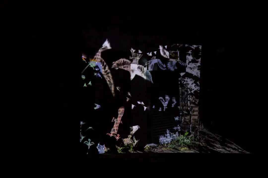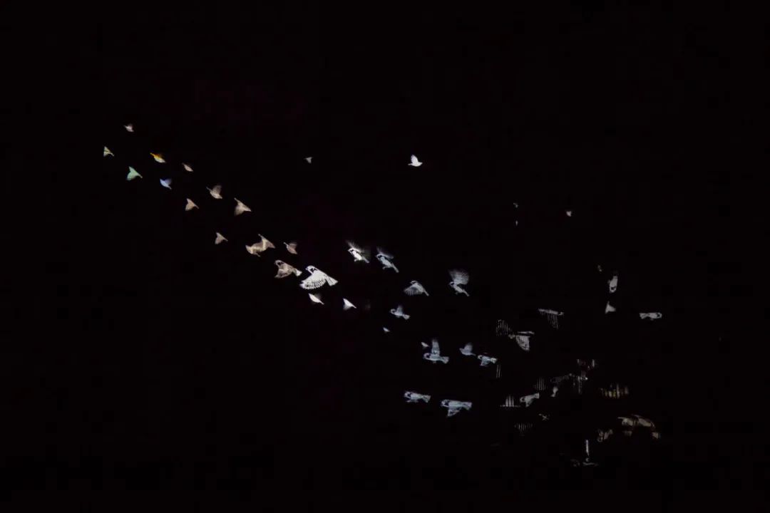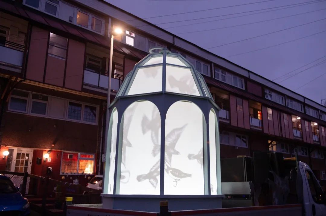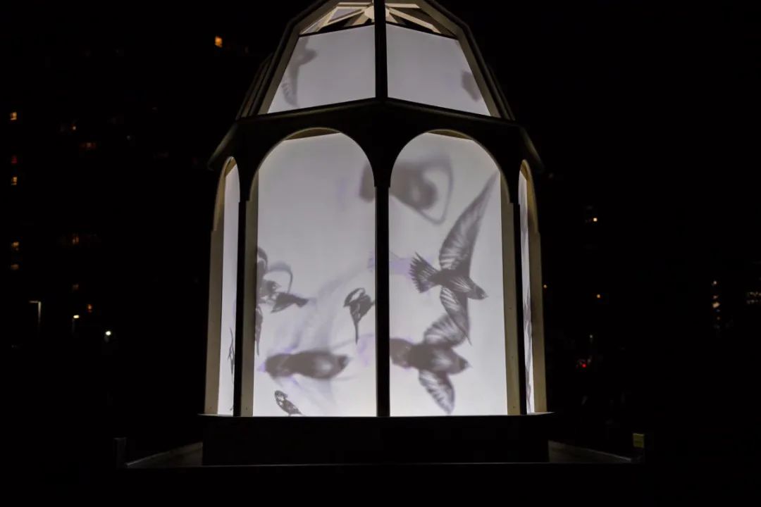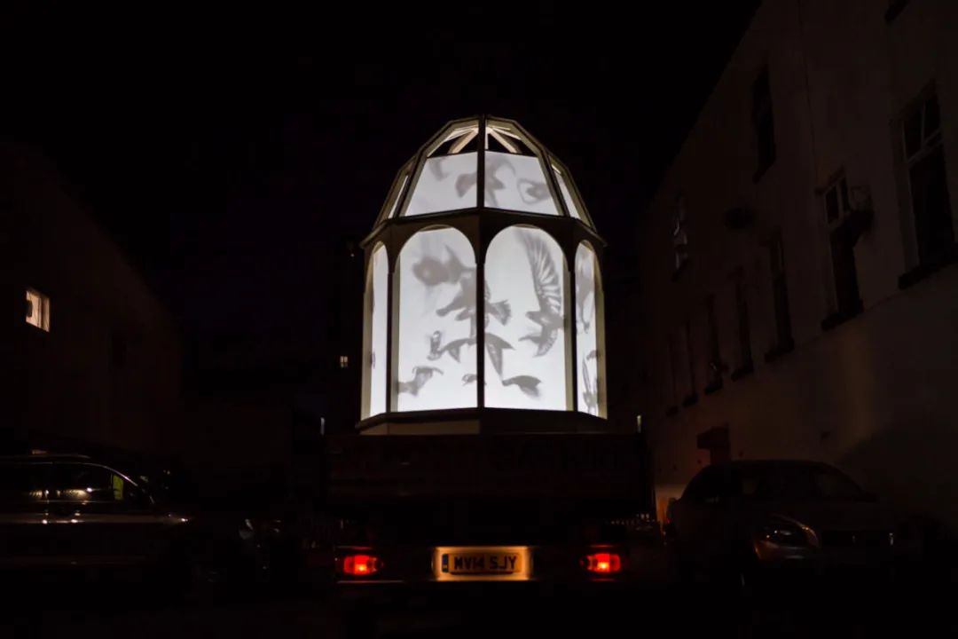 一辆卡车载着一个巨大的发光鸟笼在路上缓缓前行,鸟笼中可以看到很多飞舞着的鸟儿的身影。卡车每次会停靠下8分钟,在这期间人们可以看到鸟笼以及在附近的建筑物上投射的有关鸟儿的美丽投影。