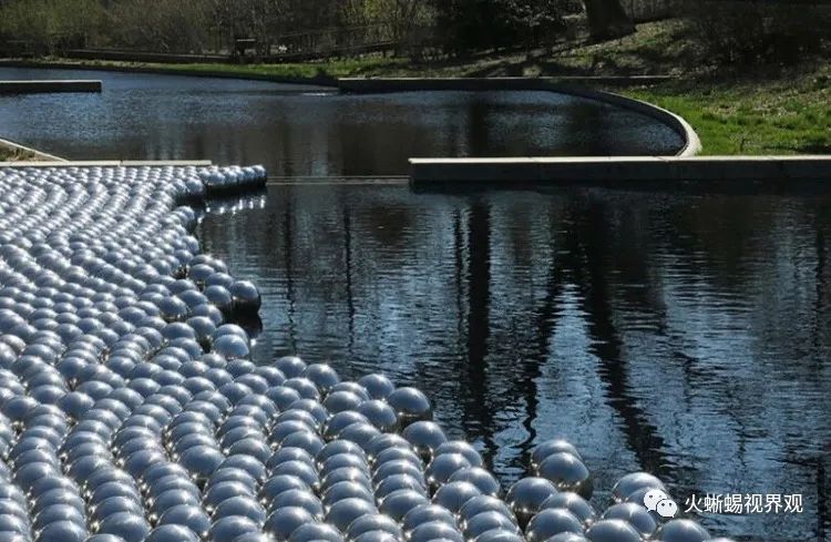 Yayoi Kusama(草间弥生)的户外装置自然少不了著名的“Narcissus Garden”(水仙花园),这是她在1966年威尼斯双年展(Venice Biennale)时创作的一件作品的重现。在植物园内230英尺长的水景中,1400个不锈钢球体漂浮在水面上,随着风和洋流移动,每一个都反映了周围的环境。(相关阅读:能看到700个自己的艺术装置 将工业简约的材料赋予生命感)