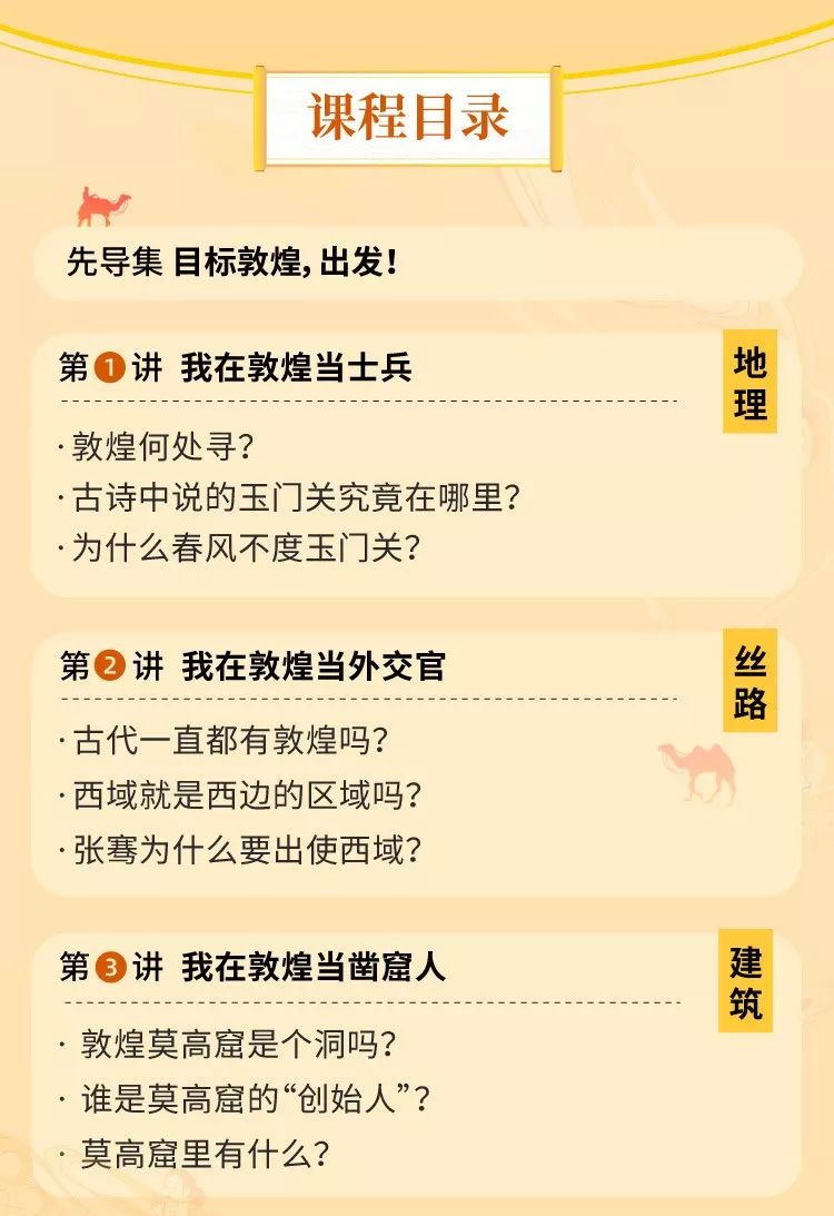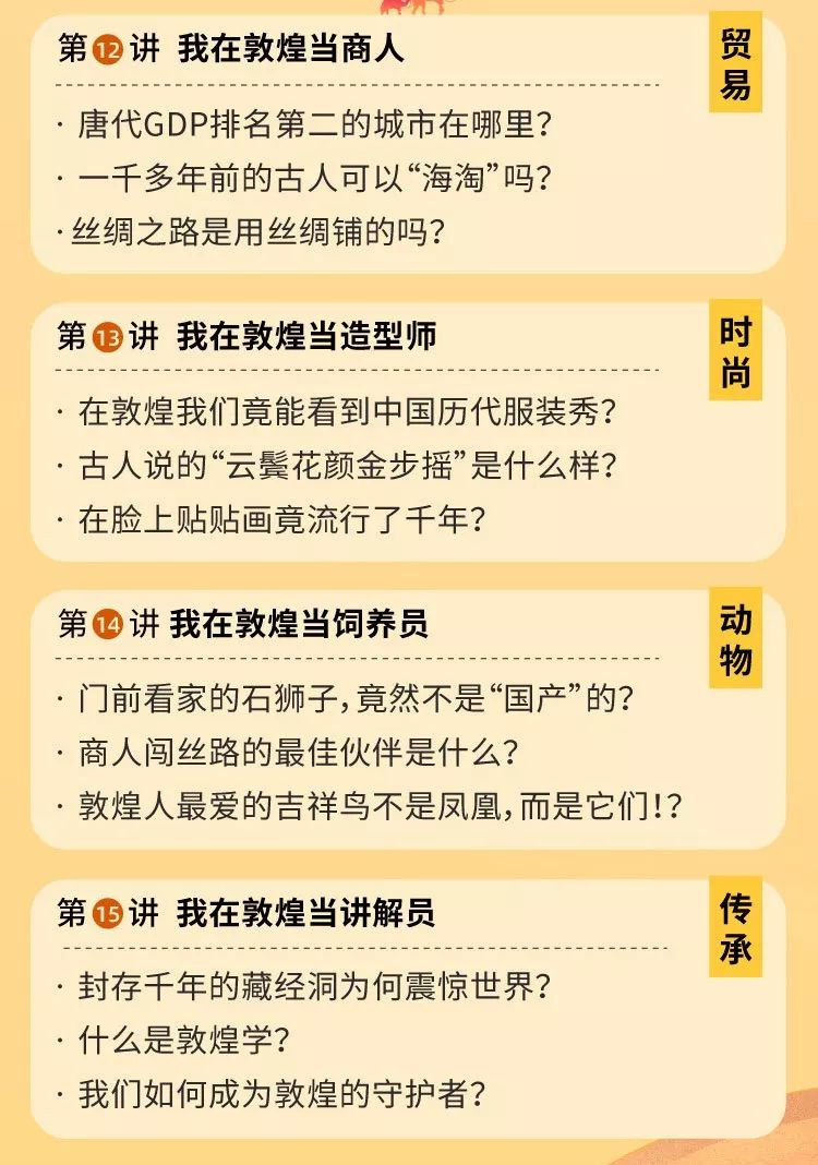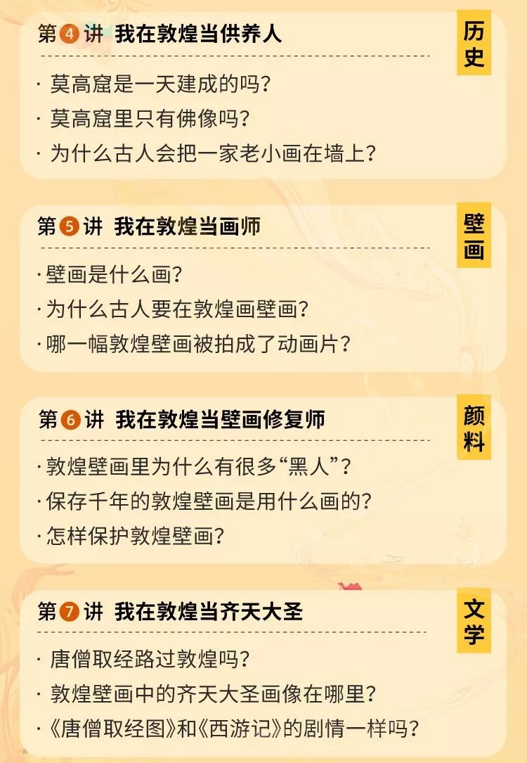 除此之外,每一节课程紧扣一个关键词。地理、历史、商贸、音乐、舞蹈、绘画……帮助孩子全方位各个角度了解敦煌,同时每节课程还会解答3个无论大人孩子都想知道的问题,推荐亲子共同学习,共同成长~