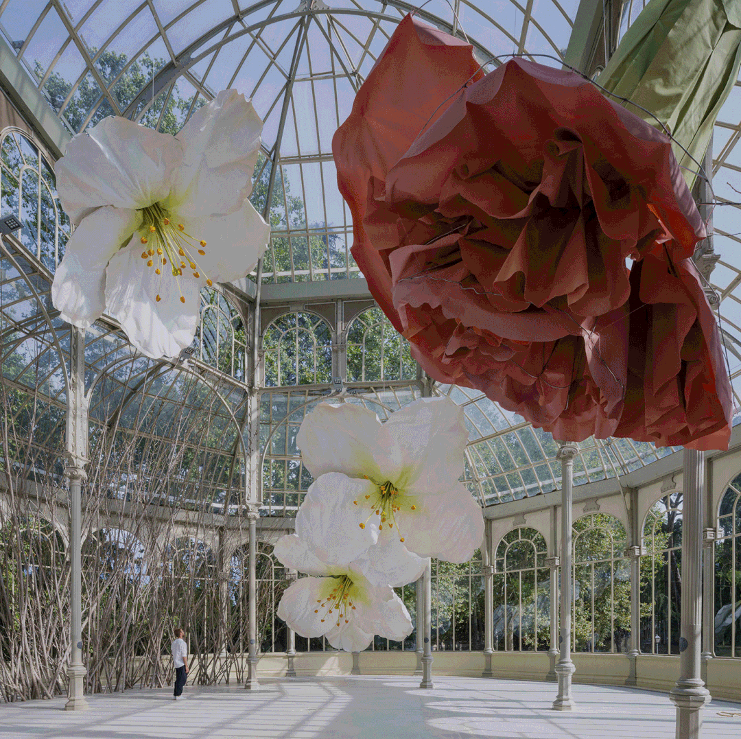 这个装置作品有一个很长又浪漫的名字:「To a raven and the hurricanes which bring back smells of humans in love from unknown places」,乌鸦和飓风从未知的地方,带回了人类的爱情气味。把十九世纪的Palacio de Cristal变成了一个巨大的沉浸式的巢穴,顶棚装饰着漂浮的花朵,造了一座被放大的植物乐园。在他的作品里,常常以独特、浪漫的视角剖析现实生活的本质。