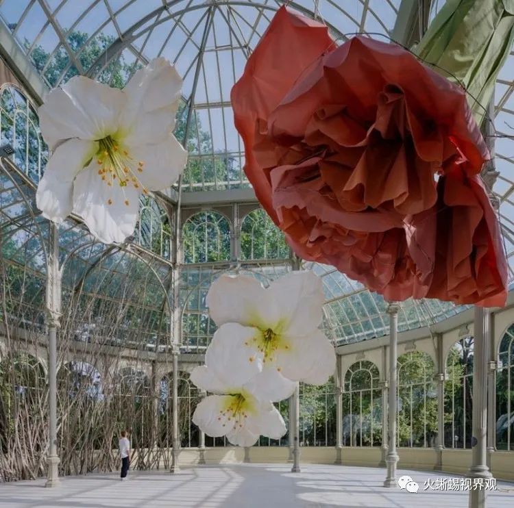 2020年夏天,艺术家Petrit Halilajj(佩特里特·哈利拉吉)将马德里的Palacio de Cristal(水晶宫)改造成一个巨大的花巢。艺术家通过打开窗户、设置结构、设置喂食区等方式,将这些临时装置与城市的公园连接起来,吸引鸟类和其他生物在公园栖息或穿行。Petrit Halilajj(佩特里特·哈利拉吉)与他的生活伴侣、艺术家álvaro urbano合作,用精致的钢框架和彩色帆布制成的大花朵装饰了他的巨大鸟巢。(相关阅读:将著名旅行打卡地“水晶宫”变成巨大的花巢,疫情之后的第一个展览就如此浪漫!)