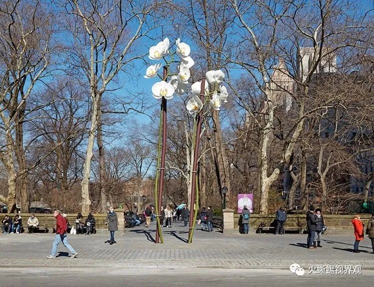 游客从中央公园的东南角进入中央公园,艺术家Isa Genzken的“Two Orchids”(两朵兰花)耸立在游客上方。2016年夏天,这对高度分别为34英尺和28英尺的巨型花朵出现在人们视野里。这些雕塑最初在2015年的威尼斯艺术双年展上展出,尽管它们是不锈钢框架,但看起来精致而柔韧。非常细的茎系在笔直的金属轴上,支撑着一簇巨大的白花。