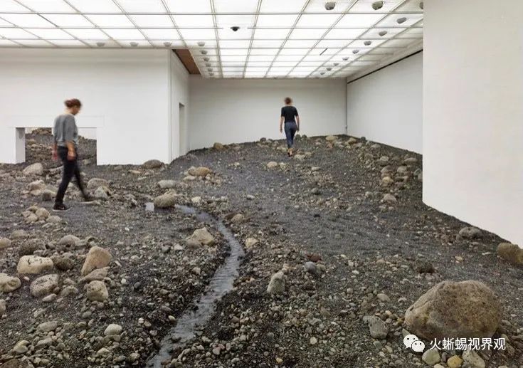 艺术装置大师Olafur Eliasson(奥拉维尔·埃利亚松)在丹麦Louisiana’s Museum of Modern Art(路易斯安那现代艺术博物馆)展出了“Riverbed”(河床),这是一幅横跨画廊南翼的巨大景观。岩石的表面覆盖了地板,创造了一个地形,水流蜿蜒穿过室内。游客从典型的瓷砖地板步行,到松散地形上的台阶,最后是沿着河流的路线。这个装置是对基地历史的直接参考-----路易斯安那州现代艺术博物馆的南翼于1982年正是被添加建造在一个斜坡上。(相关阅读:把自然装进屋里的装置艺术)