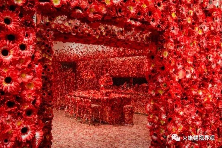 在2018年墨尔本NV三年展上,Yayoi Kusamacame(草间弥生)以“花痴”的形式探索“毁灭”。这个装置从一个相对普通的、陈设简单的房间开始,很快就被参观者留下的美丽的红色花朵“病毒”所改变。这个互动的作品是关于草间弥生对“无限”概念的最早体验之一。在她很小的时候,有一天,她那孩童般的眼睛环顾着厨房,对一块绘有红花图案的桌布产生了兴趣。她盯着桌布上的红色花朵图案,抬头一看,天花板、窗户和柱子似乎都被涂上了同样的红色花朵图案,甚至整个房间,我的整个身体,整个宇宙布满了红色的花朵,在那一瞬间,她的灵魂被毁灭了……这不是幻觉,而是现实本身。