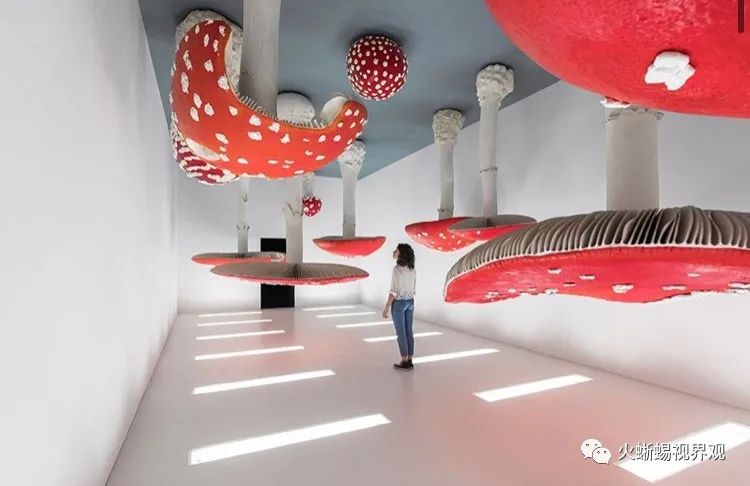 这是比利时艺术家Carsten Höller(卡斯滕·霍勒)首次在米兰普拉达基金会(Fondazione Prada)举办了一场沉浸式展览,作为一个由心理物理刺激和互动工具组成的“可能性之村”,这个装置展览设计了迷宫般的感官路线,观众会遇到让人迷失方向的“颠倒蘑菇放”,这是一件沉浸式艺术作品,由超大的真菌从天花板上生长,在游客的头上无休止地旋转。这个装置现在也成为普拉达基金会的永久团体展览的一部分。