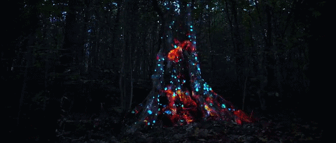 《元素》以生活中的五种元素空气、土壤、水、火、以太为素材,以浮木、树干、岩石为放映“幕布”,在光影、图像、音乐中变幻出一个神奇世界,开启一段视听之旅。