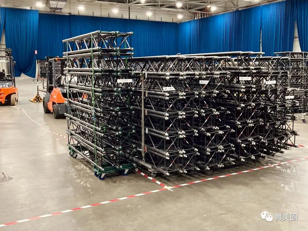部分尚未拆封的全新Clay Paky灯光设备,整齐排列在后场。