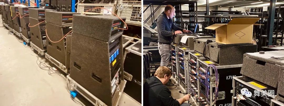 在灯光团队的仓库,正在准备用于驱动灯光系统的各种设备。