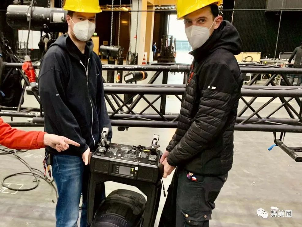 同时,在现场第一台电脑灯“1号灯”已经开始安装,希望两位灯光部门的朋友,在完成1781台灯光安装后仍然能保持微笑。