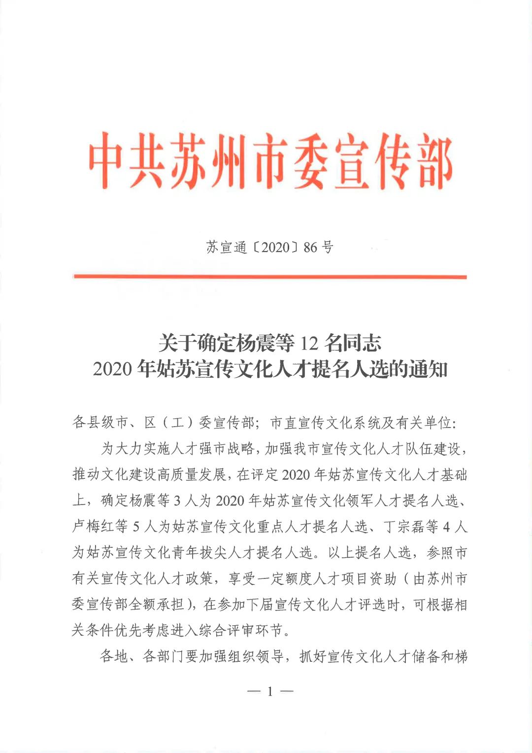 中共苏州市委宣传部发布了2020年姑苏宣传文化人才名单,确定金螳螂文化董事长杨震先生为2020年姑苏宣传文化领军人才提名人选。