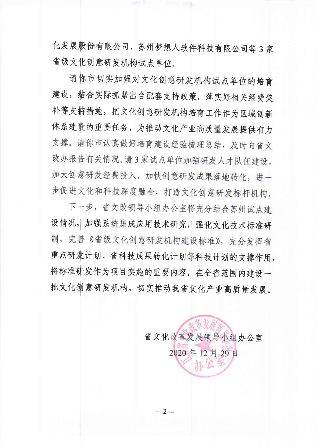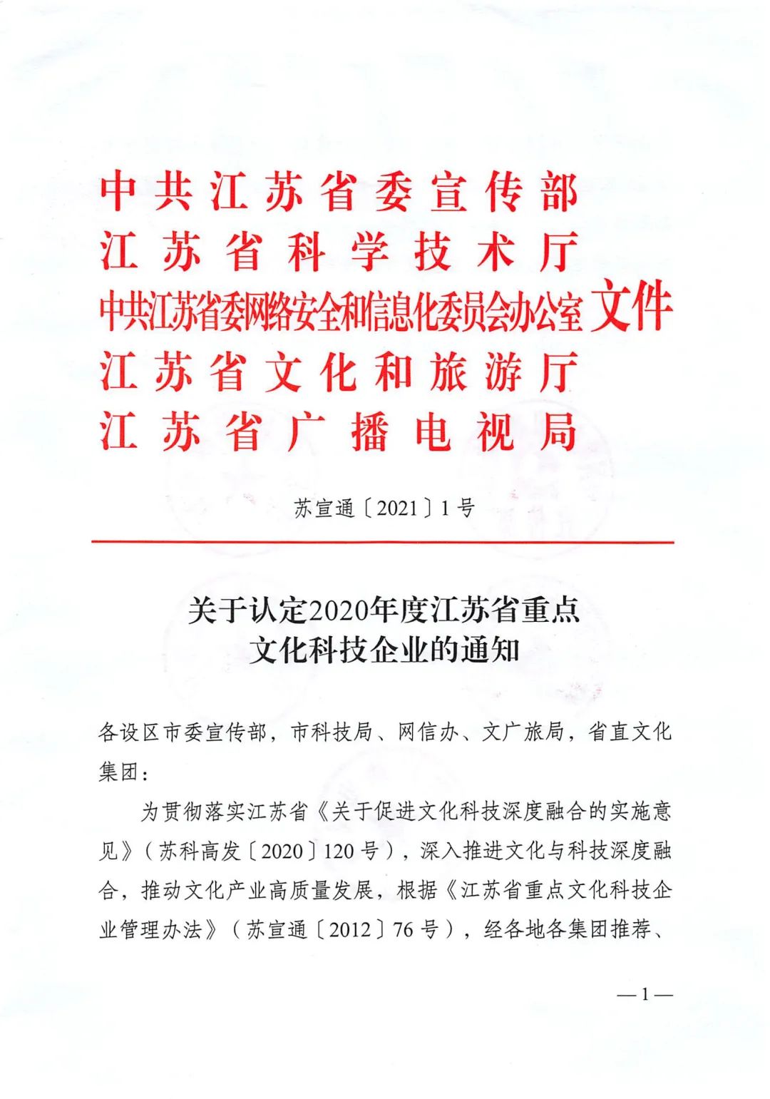 为贯彻落实江苏省《关于促进文化科技深度融合的实施意见》,深入推进文化与科技深度融合,推动文化产业高质量发展,根据《江苏省重点文化科技企业管理办法》,经各地各集团推荐、专家评审、部门会商,现认定苏州金螳螂文化发展股份有限公司等45家企业为2020年度江苏省重点文化科技企业。