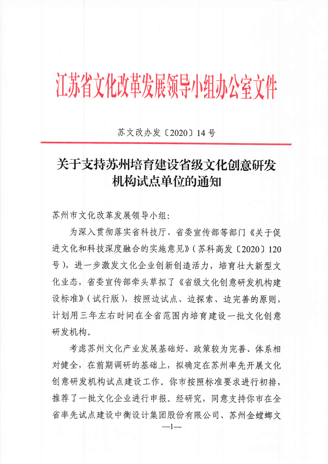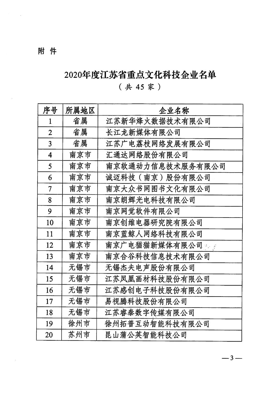 中共江苏省委宣传部、江苏省科学技术厅、中共江苏省委网络安全和信息化委员会办公室、江苏省文化和旅游厅、江苏省广播电视局联合发布了“关于认定2020年度江苏省重点文化科技企业的通知”,金螳螂文化公司榜上有名 。
